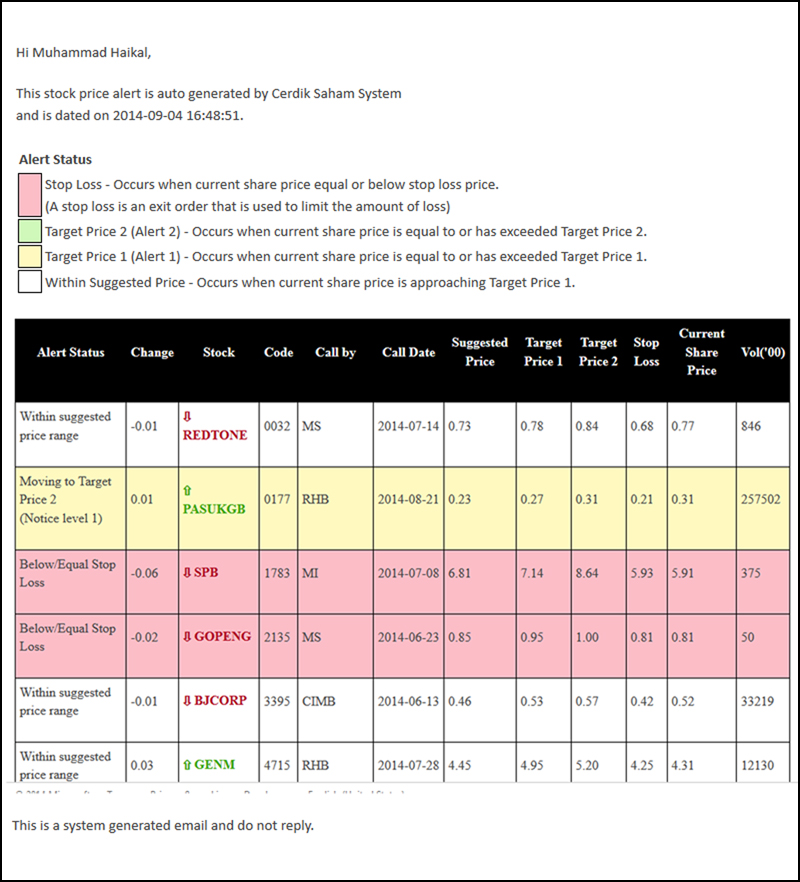 Email alerts are only sent on the stocks you follow - Price set by analysts - You can change your stocks at any time (Maximum 50 stocks) - Minimize your downside risk - Stay ahead of the crowd - Help to determine the best stocks to buy, sell and hold - Smart user interface - Minimize your need to monitor your share price infront of computer